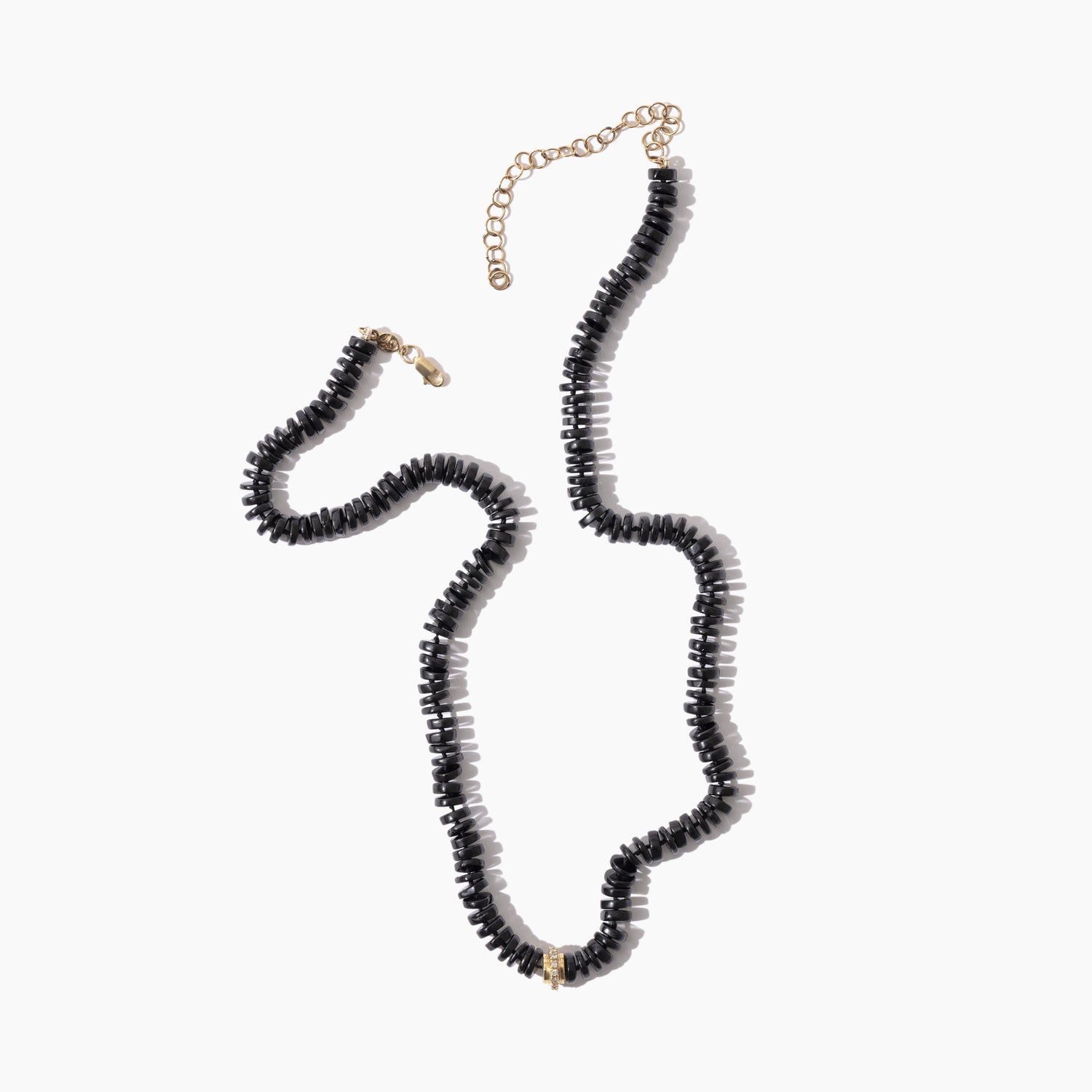 Black Onyx faceted tyre necklace, set in 14-karat gold and sparkling white diamonds.