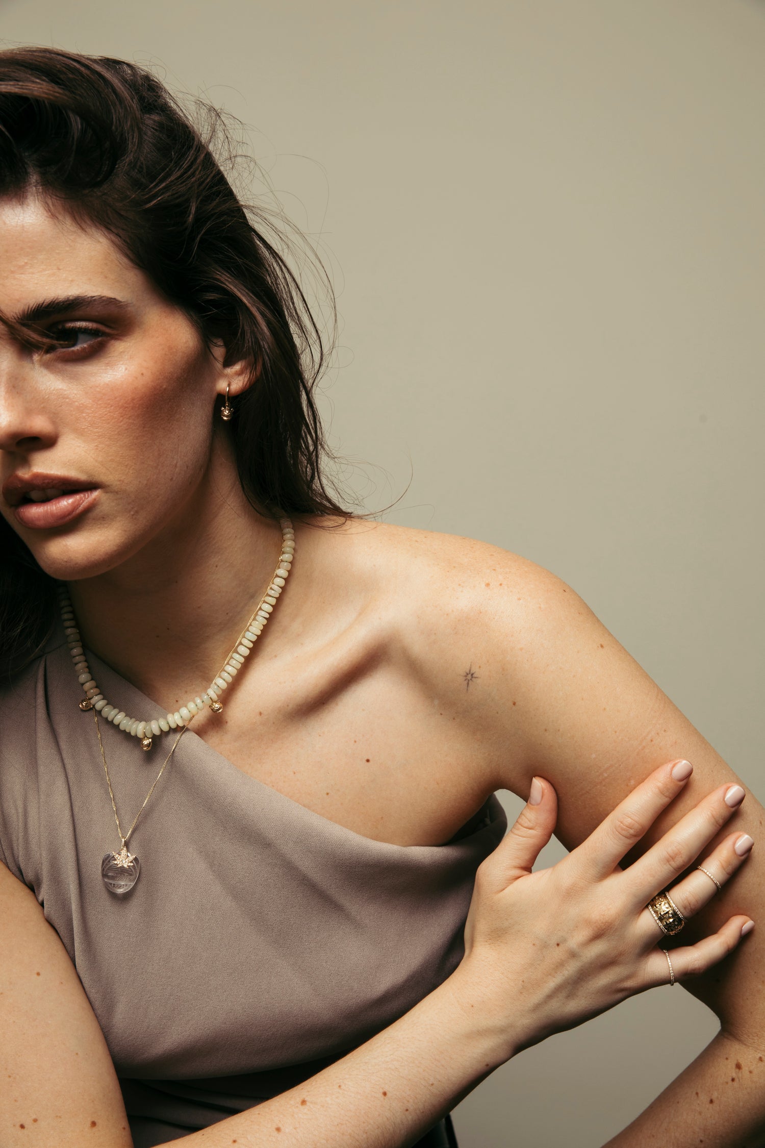 Model wears a Jaguar stone pendant in a longer chain and Totem Opal Necklace.